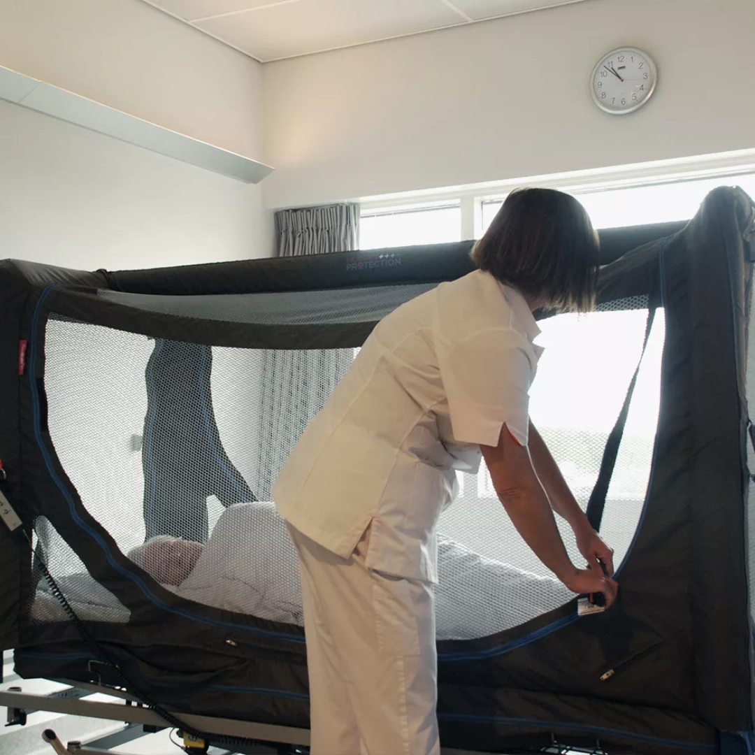 Het FeelSafe Pro tentbed biedt een veilige slaapomgeving voor onrustige en valgevaarlijke patiënten of bewoners die geen ziekte-inzicht hebben en regelmatig zonder toezicht het bed verlaten. Denk aan kwetsbare ouderen, ernstig vermagerde cliënten, of bewoners met dwaalgedrag, acute verwardheid of delier. Dit tentbed voorkomt het gebruik van fysieke fixatie of sederende medicatie.